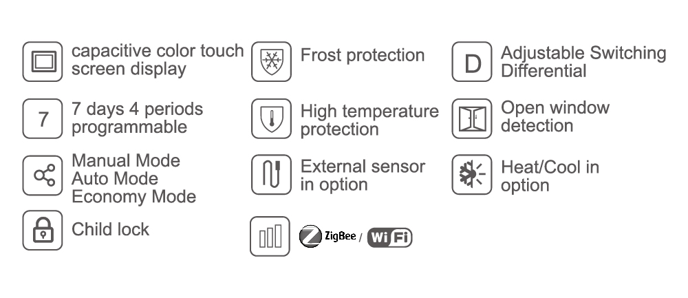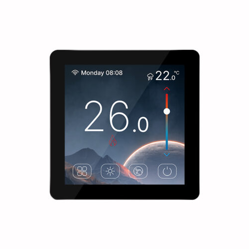 Revolutionizing daily interaction, the HT-CS08 offers responsive touch screen operation where users can effortlessly set and adjust their preferred temperature using a smooth sliding temperature bar. This fast and sensitive user interface, similar to a modern smartphone, ensures quick and easy adoption. The high-quality display clearly shows all symbols, providing an excellent user experience.
