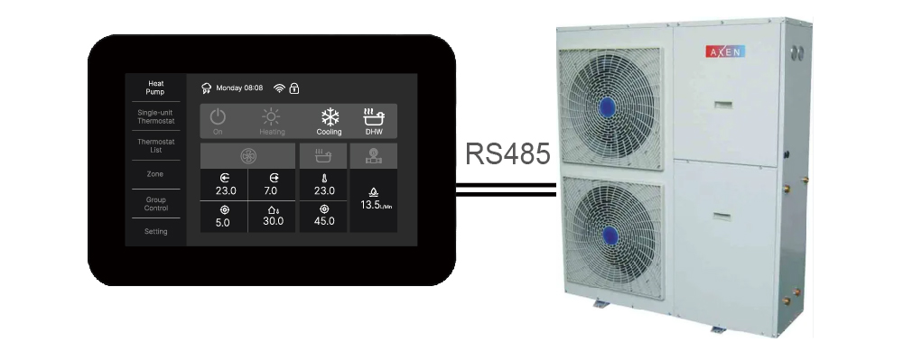 With an intuitive 7” screen , our heat pump thermostat will show the real-time Axen heat pump’s inlet& outlet water, target temperature, outdoor temperature, hot water temperature, target hot water temperature, water flow volume, pump status, solar pump status, frost status and so on.