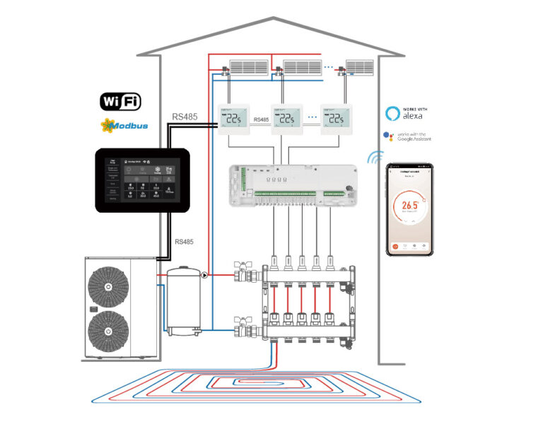 Except the Modbus interface connected to the heat pump control Modbus, we’re also offering the extended interface for the underfloor heating plus the fan coil controls. Seeing below picture,the thermostat will be connected to the 16 zones underfloor heating controller which manages the hydronic floor heating for multi-rooms. In addition, the on-wall thermostats also gives convenient 3 speeds or 0-10V control to the fan coil valve and fans.