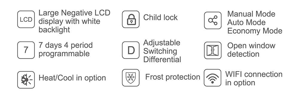 • Other function: Child lock, Open window detection, Frost protection, Temp. calibration